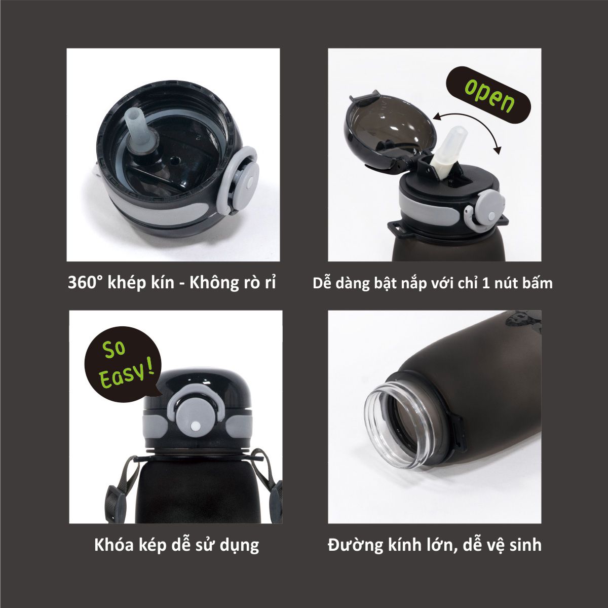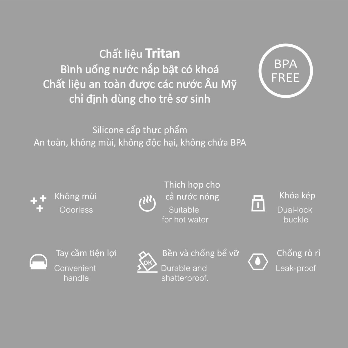 CẢNH BÁO: KHÔNG ĐƯỢC sử dụng lò vi sóng, máy tiệt trùng hơi nước và nước đun sôi để tiệt trùng. Vui lòng sử dụng ống hút để uống nước, nhiệt độ nước trong bình phải dưới 40 độ C để tránh bị bỏng. Không đựng thức uống có gas để tránh bị nước phun ra khi mở nắp bình.