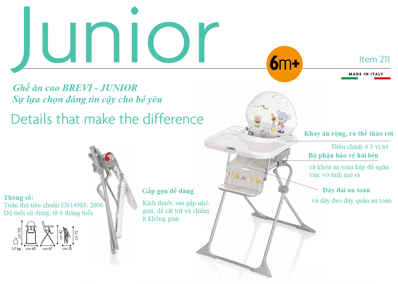 - Ghế ăn Junior được chứng nhận phù hợp với tiêu chuẩn Châu Âu EN 14988:2006 nên bạn có thể tin dùng.
