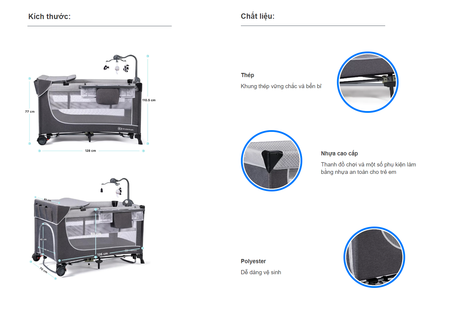 *** Phụ kiện: nệm treo cho trẻ sơ sinh, kệ để phụ kiện và tã lót, thanh đồ chơi quay có nhạc và đèn, bàn thay tã, túi đựng. Không có thanh bập bênh.