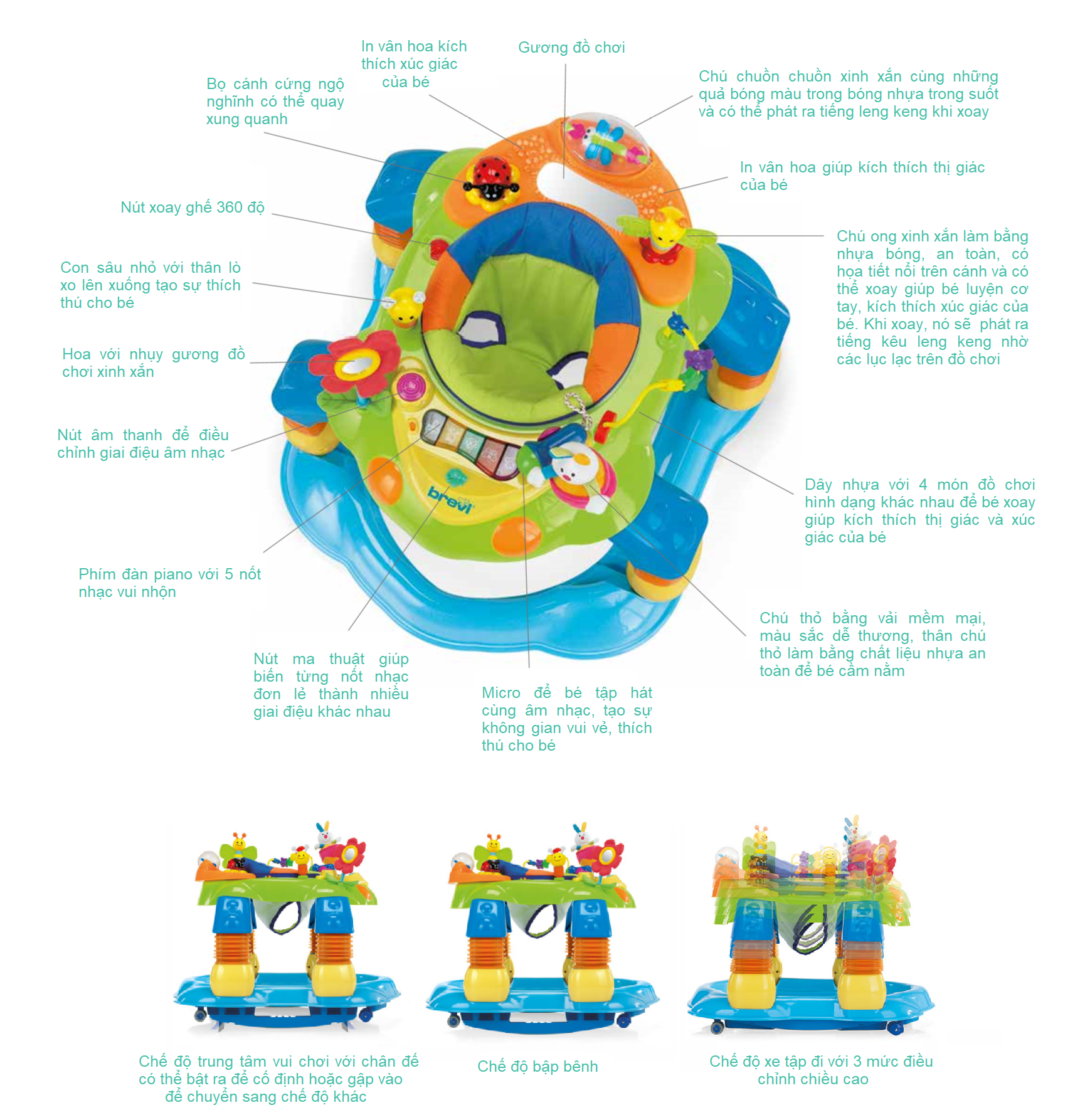 − Xe gồm 14 thiết bị giải trí vui nhộn kích thích mọi giác quan của bé, ghế ngồi có thể xoay được 360° giúp bé tiếp cận dễ dàng với vòng đồ chơi xung quanh.